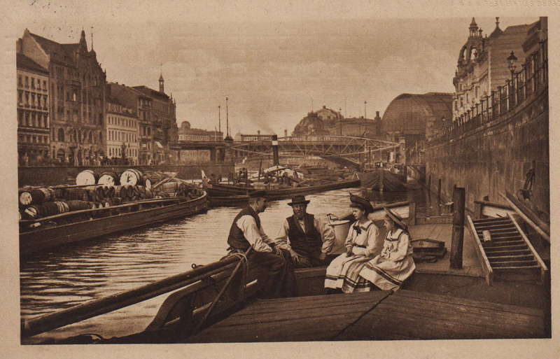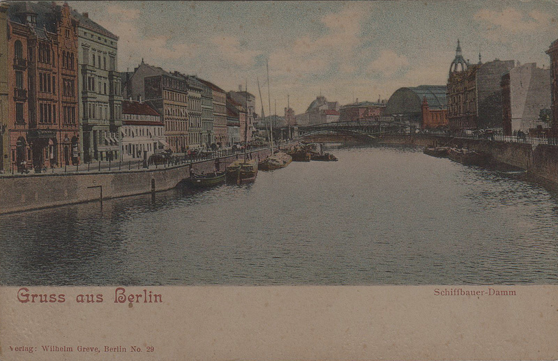 AKs aus ca. 1910, Schiffbauer-Damm, Spree, Blickrichtung Bhf. Friedrichstraße