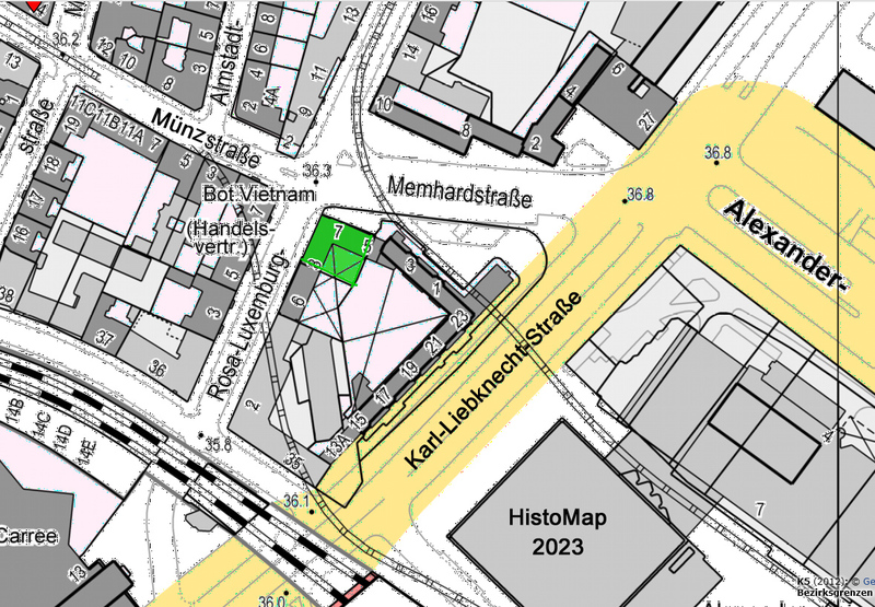 heute Memhardstraße 7, 5 Ecke Rosa-Luxemburg-Straße