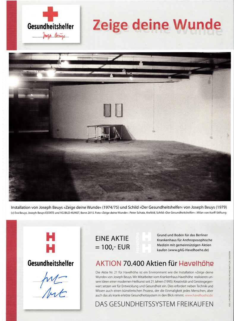 Im Mittelpunkt der 21. Aktie steht ein Foto der Installation „Zeige deine Wunde“ aus dem Jahr 1974/75 von Joseph Beuys. Der Aktionskünstler prägte den Begriff „Gesundheits-helfer“ der sich oben als Logo mit dem roten Kreuz auf der Aktie befindet. Das Besondere dieser Aktie ist, dass sie in Havelhöhe entstanden ist. Jede Aktie ist von einer/m MitarbeiterIn des Gemeinschaftskrankenhauses Havelhöhe – einer/m Havelhöher GesundheitshelferIn – original unterzeichnet. Die 21. Aktie bildet den Auftakt für die „Aktion 70.400“, mit der wir im Sinne einer Beuys’schen Aktion das Gesundheitssystem freikaufen wollen.