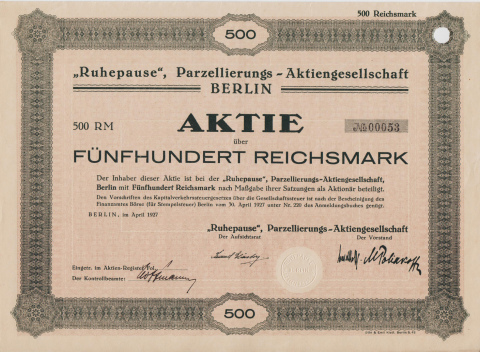 Zweck der Gesellschaft: An- und Verkauf von Grundstücken zum Zwecke der Parzellierung für die Errichtung von Wochenendhäusern und zu ähnlichen Zwecken. Das Aktienkapital wurde anscheinend allein von den jüdischen Gründern übernommen. Dadurch ist auch erklärlich, warum die Gesellschaft im Handbuch der deutschen Aktiengesellschaft von 1943 nicht mehr aufgeführt ist.