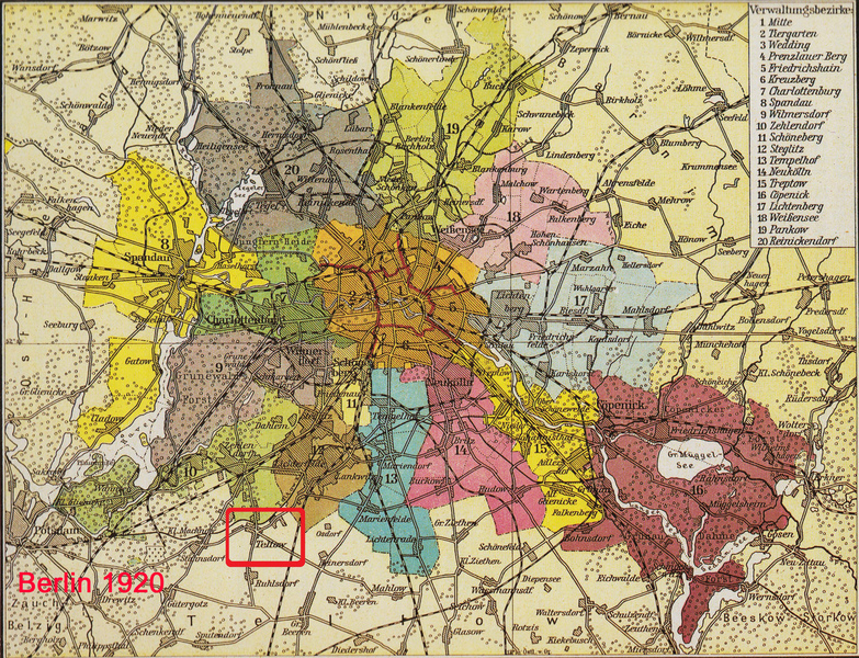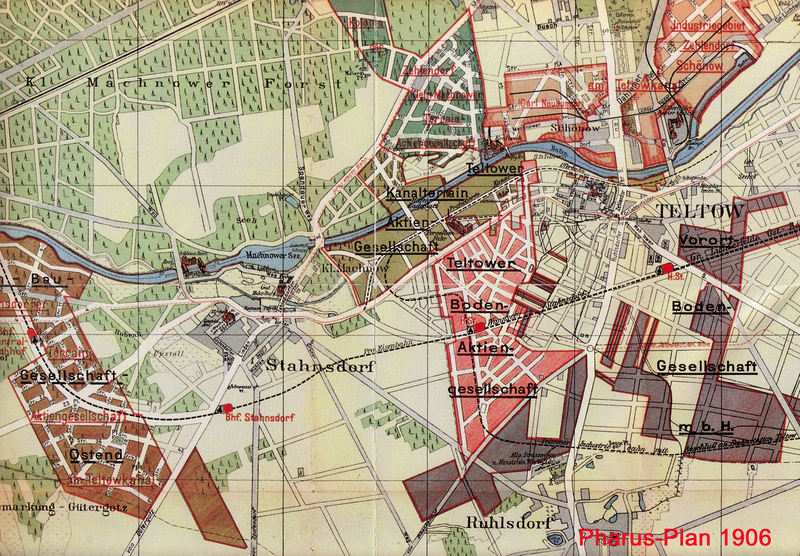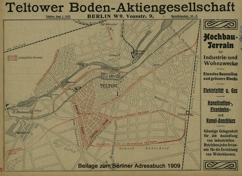 Zweck: Erwerb, Verwertung, Bebauung und Veräusserung von Grundstücken, insbesondere in der Gemarkung Teltow und Umgebung. Die Gesellschaft hat „daselbst“ 10 Grundstücke in einer Größe von 151 ha 24 a (rund 1,5 km²) zum Kaufpreis von 3.448.724 Mark erworben. Der größte Teil dieser Grundstücke wurde von der „Vorort-Boden-Gesellschaft m.b.H.“ gekauft.