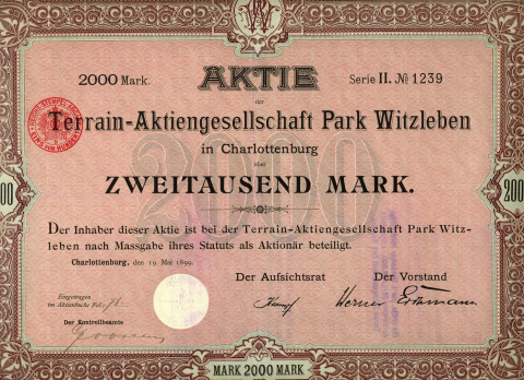 Die Gesellschaft wurde am 20.04.1899 gegründet. Zweck war der Erwerb, die Verwaltung, eventuell teilweise Bebauung und "demnächstige" Wiederveräußerung oder sonstige Verwertung der rings um den Lietzensee in der Stadt Charlottenburg belgenen Besitzung „Park Witzleben“ mit einem Umfang von ca. 35 ha 32 a 42 qm = 24.903,6 qR (= 353.242 m²) sowie solcher weiteren Grundstücke.