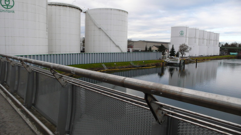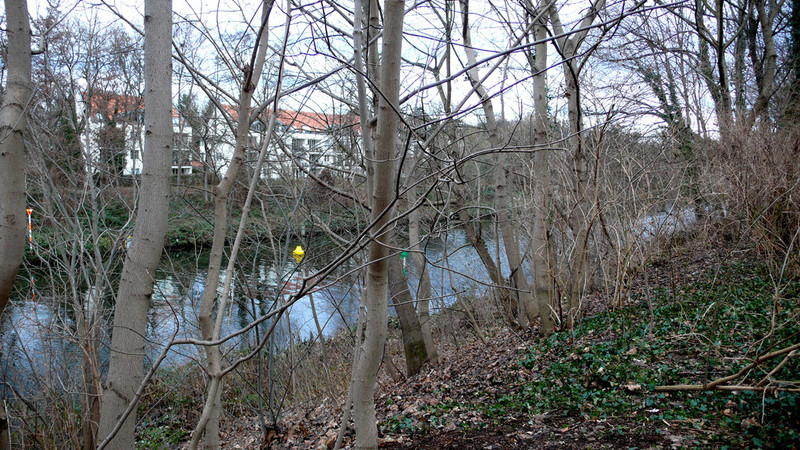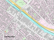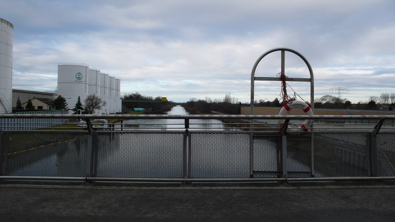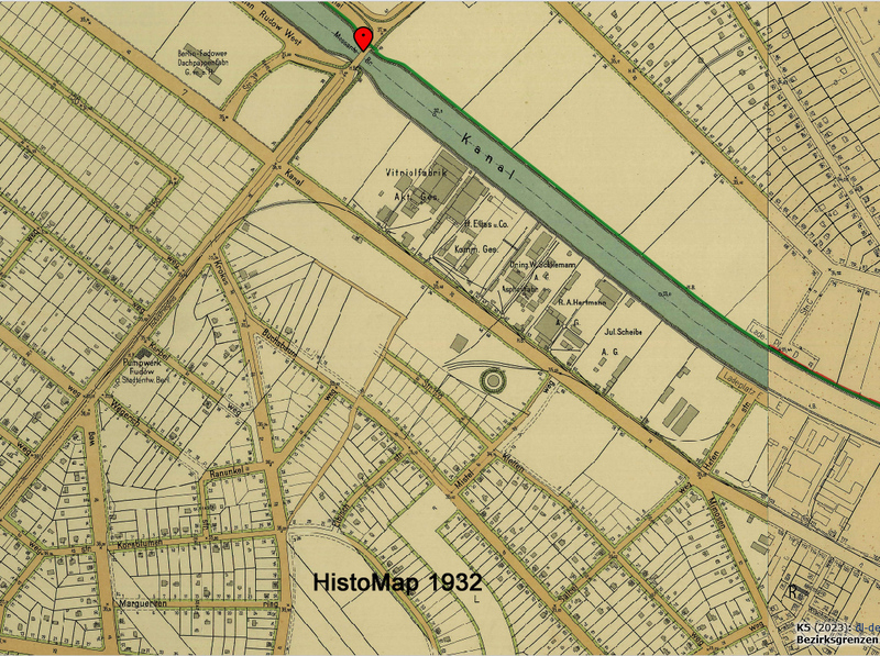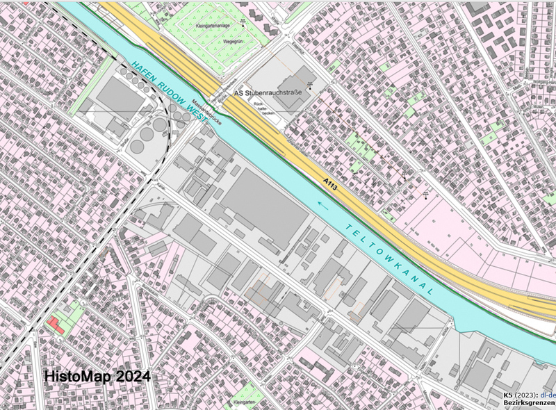 1 + 2 Der Teltowkanal im Jahr 2012 von der Massante Brücke (Stubenrauchstraße) mit dem Gelände der Terrain-Gesellschaft. Auf der nord-östliche Seite des Kanals verläuft heute die Stadtautobahn 113n.