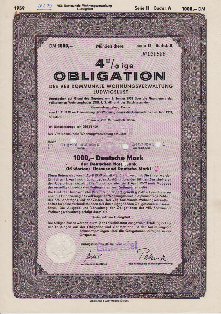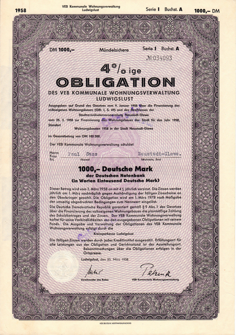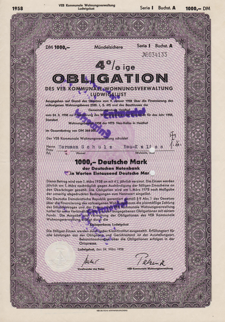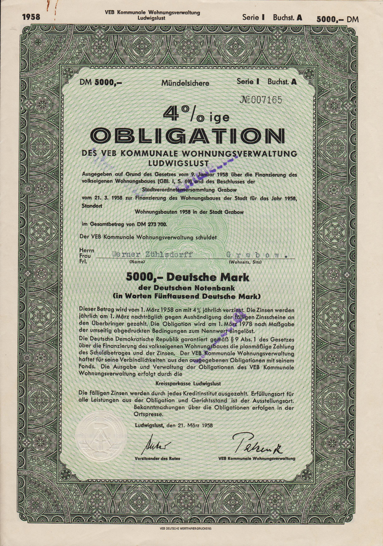 Die Anleihe, Serie III vom 02.03.1960 über 665.500 DM diente der Finanzierung des Wohnungsbaues der Stadt für das Jahr 1960, Standort: Neustadt-Glewe Auf dem Hohen Felde