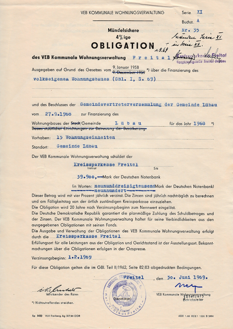 Die Sparkasse Freital hat selbst eine Obligation mit dem sehr hohen Wert von immerhin 500.000 DM von der VEB KWV Berlin-Lichtenberg gezeichnet (Link). Freital hat sehr viel Obligationen für die Finanzierung des Wohnungsbaus und soziale Einrichtungen emittiert.